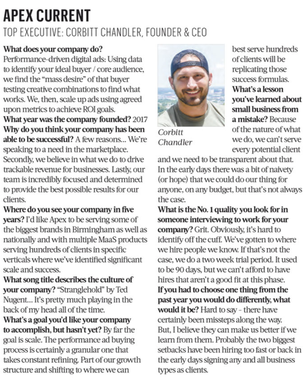 Corbitt Chandler, Founder & CEO of Apex Current, casts the vision for growth and serving some of the biggest brands in Birmingham and the nation.