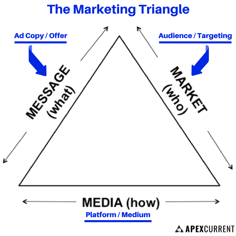 Dan Kennedy's marketing triangle displays this idea quite perfectly. Changing one of these three factors creates a new iteration process. But, you can take those historical key learnings and refined processes to the table which overtime lead to better decision making processes out the gates.